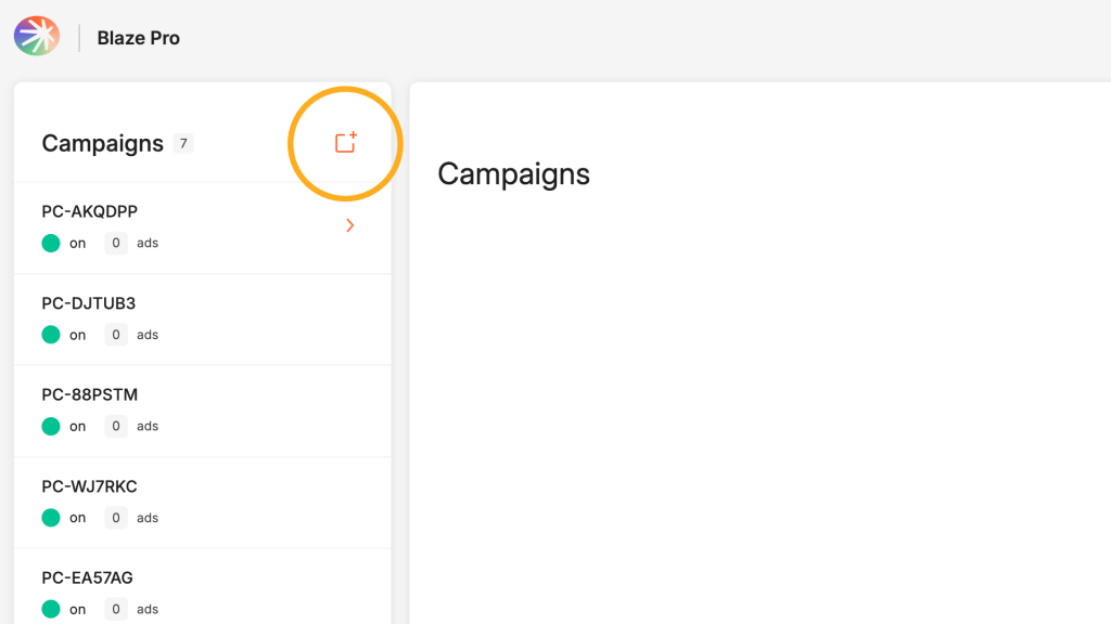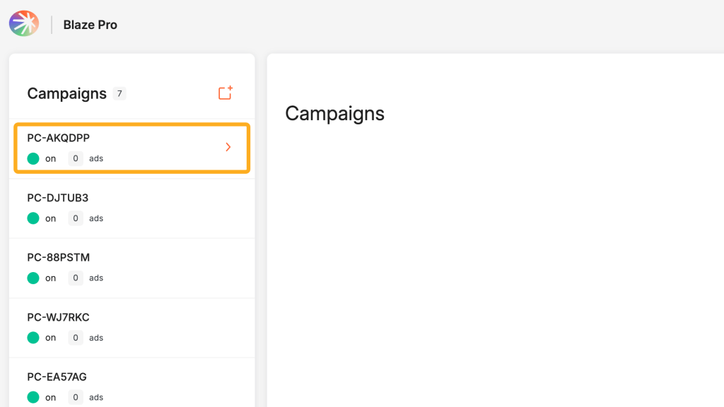 To navigate to the campaign view, click the Blaze Pro logo. To check the performance of a given campaign, click the name of the campaign. Individual ad performance is summarized under the campaign details. To view detailed performance over time, click the bar chart icon.